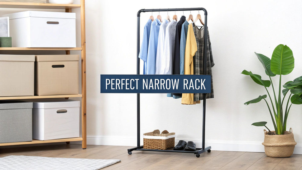 A narrow garment rack is a slim, freestanding frame for hanging clothes, specifically designed for spots where a traditional closet just won't fit. It's the ultimate secret weapon for turning a messy corner into a functional extension of your wardrobe and maximizing your closet organization, especially if you're navigating the challenges of a small apartment or bedroom.